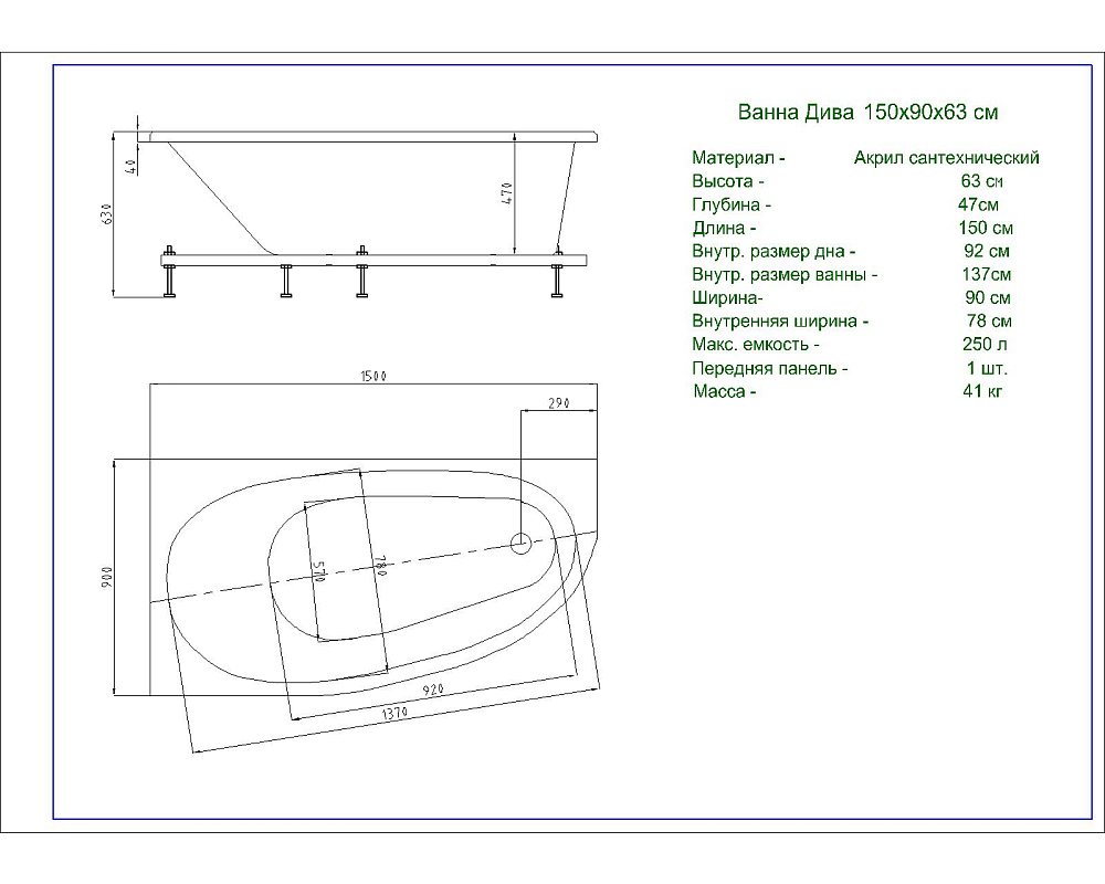 Ванна Дива 150*90см R (чаша, карскас, фронтальная панель) Aquatek