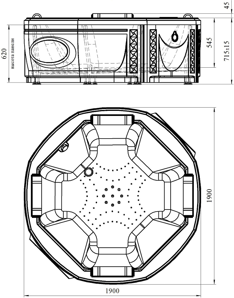 Диаметр круглой акриловой чаши составляет 190 см, а полезный объем ванны – 620 литров. Четыре комфортных места внутри купели оборудованы подголовниками и позволяют с удобством принимать водные процедуры и расслабляться в близкой компании.