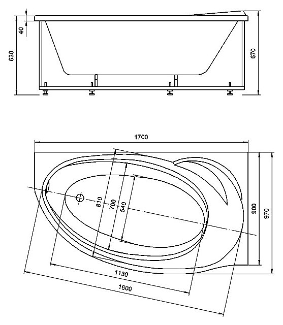 Ванна корыто PAOLINA асимметричная 170*97 см, R Azario