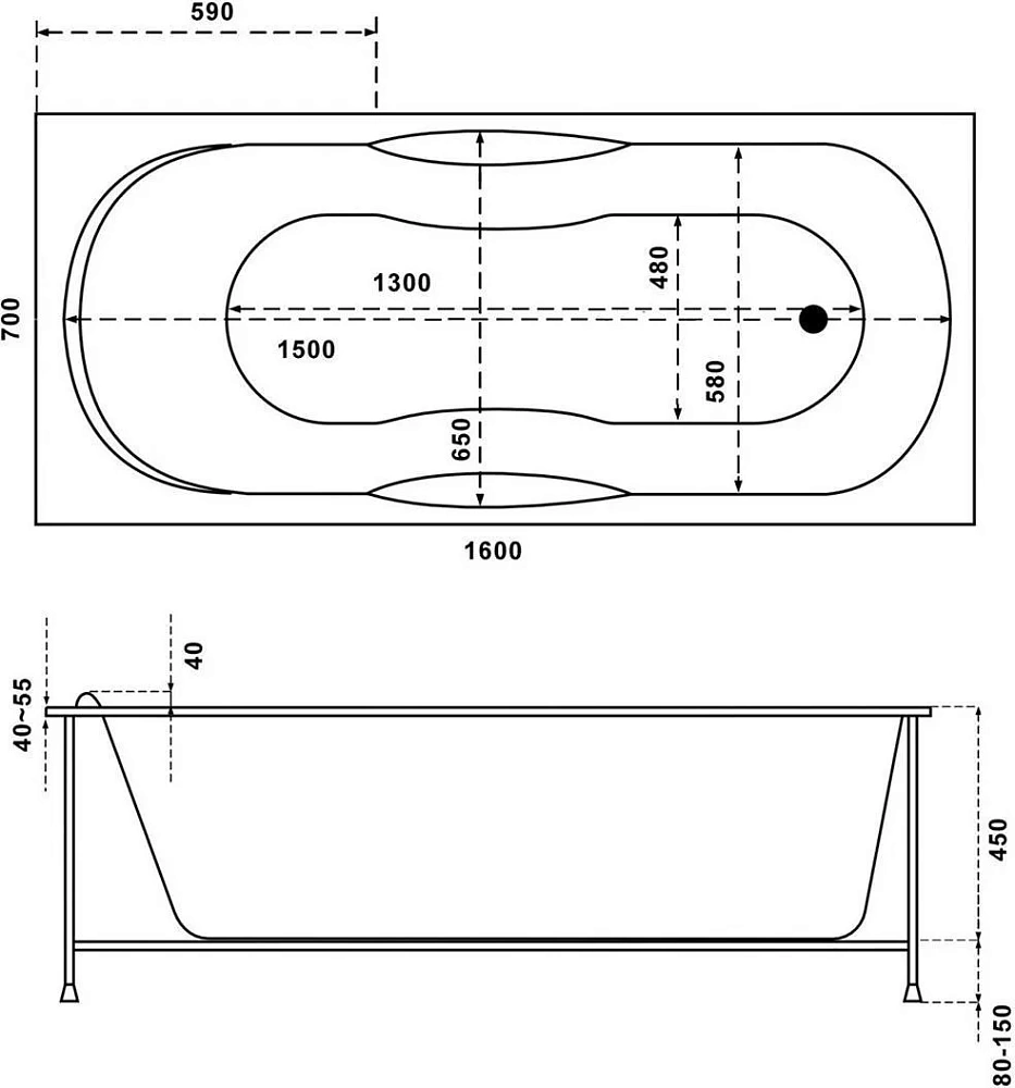 Ванна Рио 1600*700 с каркасом без экрана Bas