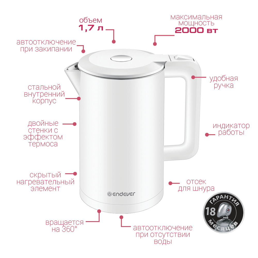 Внешний пластиковый корпус остается холодным даже при достижении водой температуры 100 градусов. Электрочайник Endever Skyline KR-235S получил скрытый нагревательный элемент с покрытием из нержавеющей стали, располагающийся на дне. Такое конструктивное решение способствует удобству очистки емкости для воды от различных загрязнений и накипи. Широкое горлышко и крышка, открывающаяся нажатием, способствуют удобству залива воды. Чайник свободно вращается на подставке, благодаря чему его комфортно поднимать и ставить на нее. Предусмотрена защита от включения без воды для длительного срока службы устройства.