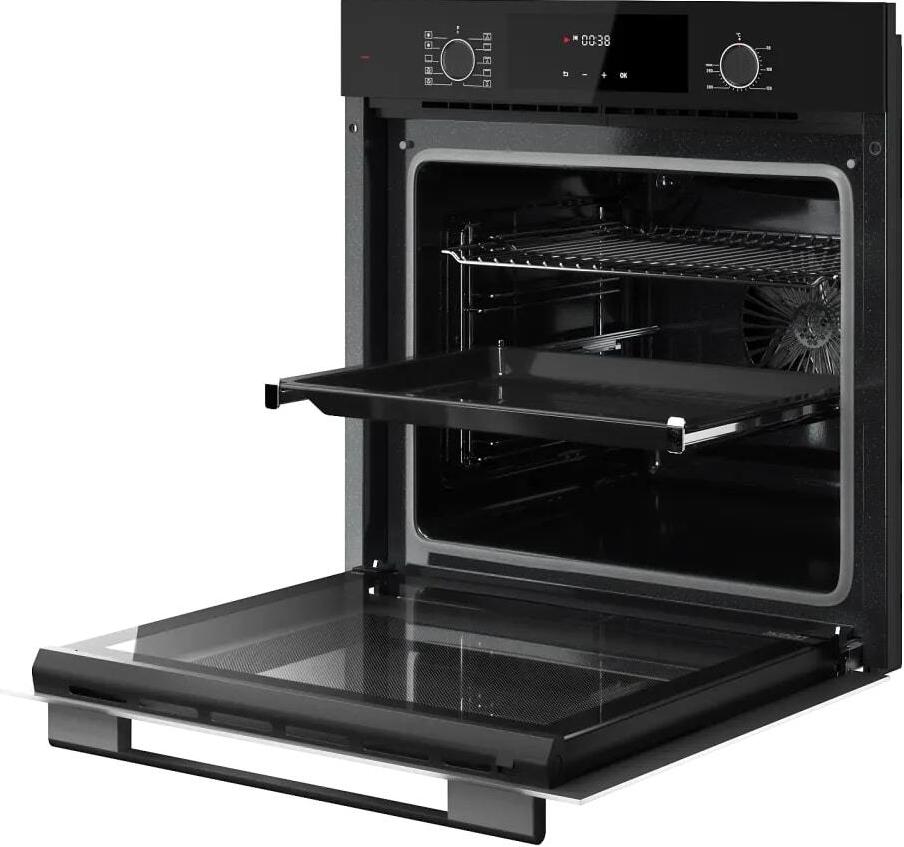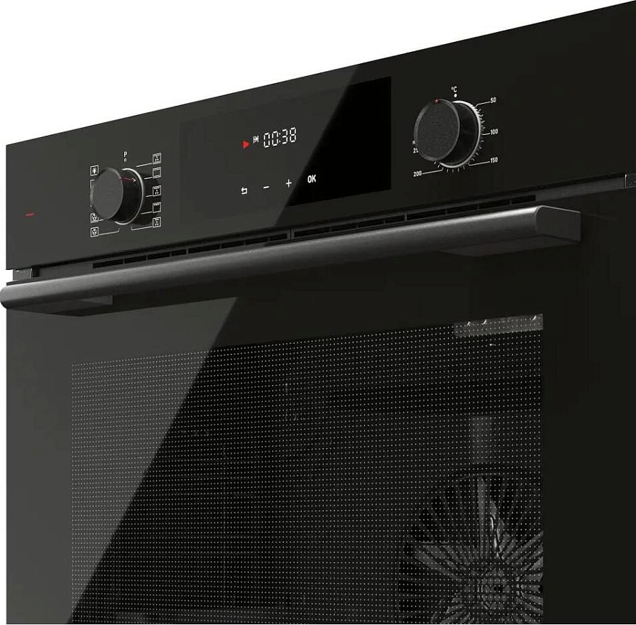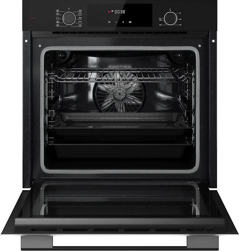 Съемная дверца и внутреннее стекло облегчают процесс очистки, а освещение духовки позволяет легко контролировать процесс приготовления. Внешний вид духового шкафа выполнен в современном дизайне, с акцентом на черный цвет и черную фурнитуру.