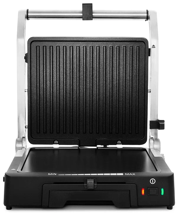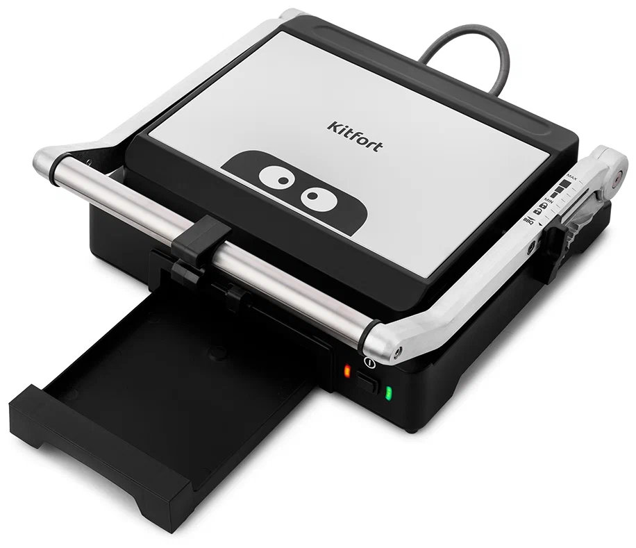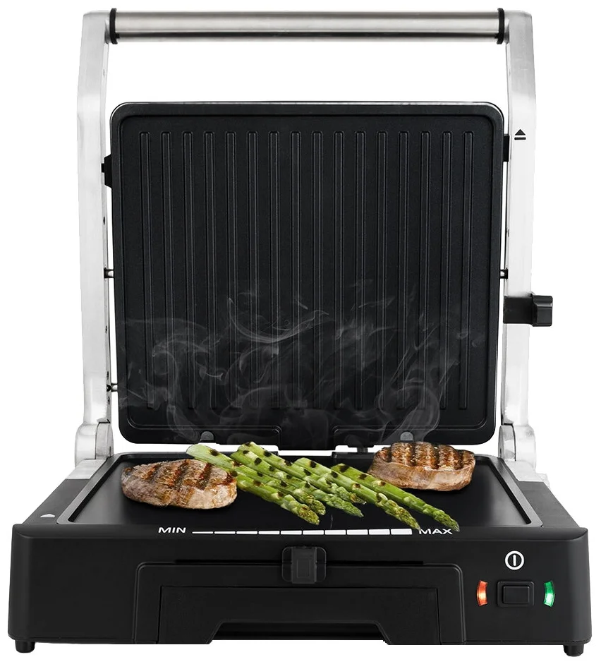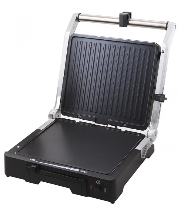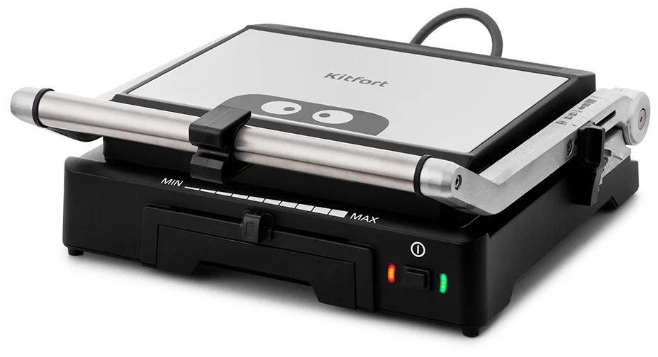 Угол наклона верхней панели устанавливается боковым фиксатором. Крышка оснащена поворотной осью, поэтому при любой толщине готовящихся продуктов панель ложится на них горизонтально, и этим достигается равномерный нагрев готовящихся продуктов.