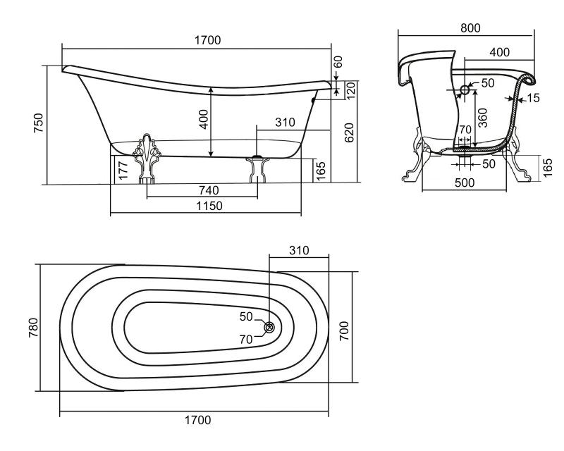 Ванна Эдельвейс 170*78*75 каменная белая матовая черные ножки AQUA DE MARCO