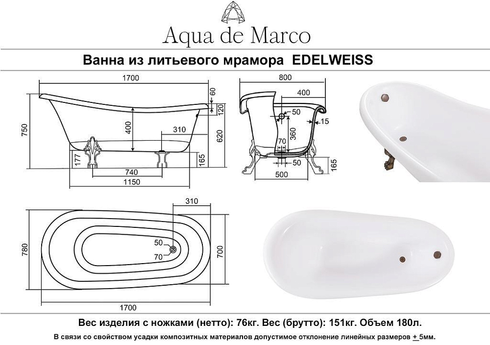 Ванна Эдельвейс 170*78*75 Nova Gel белая бронзовые ножки AQUA DE MARCO
