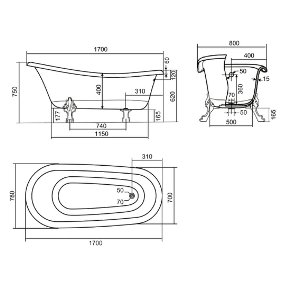 Ванна керам. Эдельвейс белая каменная ножки золотые (170*82,7*75)