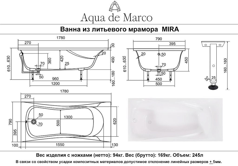 Ванна Mira Nova Gel 178*79*63 белая AQUA DE MARCO