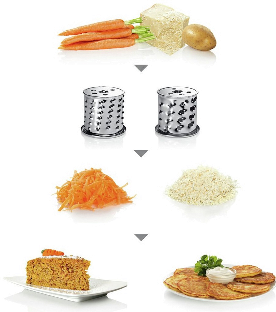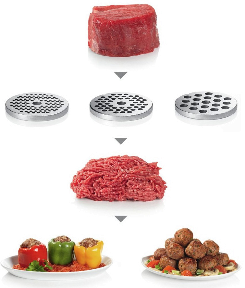 Кухонный девайс легко справляется со множеством кулинарных задач: она делает фарш разной консистенции, формирует колбаски и кеббе, шинкует овощи, натирает сыр, измельчает орехи и даже отжимает сок. При переработке жесткого мяса и твердых продуктов прибор может забиться. В таком случае в работу вступает функция реверс. Шнек прокручивается в обратном направлении и освобождает устройство от застрявших кусков мяса или жил. После использования этой опции мясорубка снова готова к использованию. Избавьте себя от рутинной работы при приготовлении блюд. В этом может оказаться очень полезной насадка терка. С помощью барабанных терок можно нашинковать или нарезать ломитками овощи и фрукты, измельчить твердый сыр и орехи. Нет предела тому, сколько блюд вы можете приготовить без особых усилий.