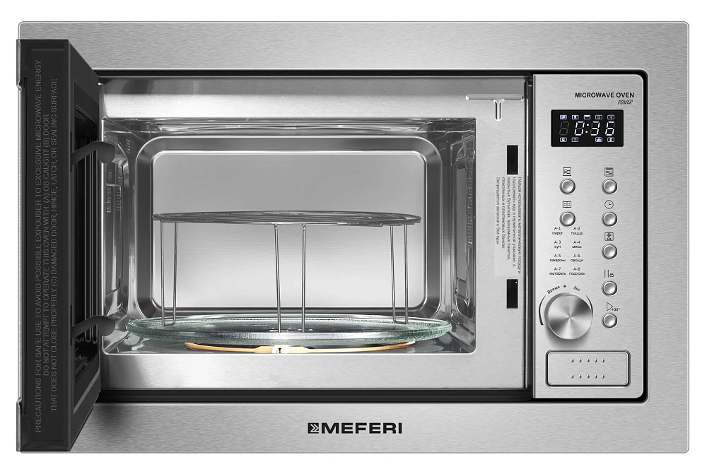 Многофункциональность: Для разнообразия вашего меню MEFERI MMO6025IX POWER имеет: 8 программ авто-меню, функцию разморозки по времени и по весу, гриль, комби-режим и 5 уровней мощности микроволн.
