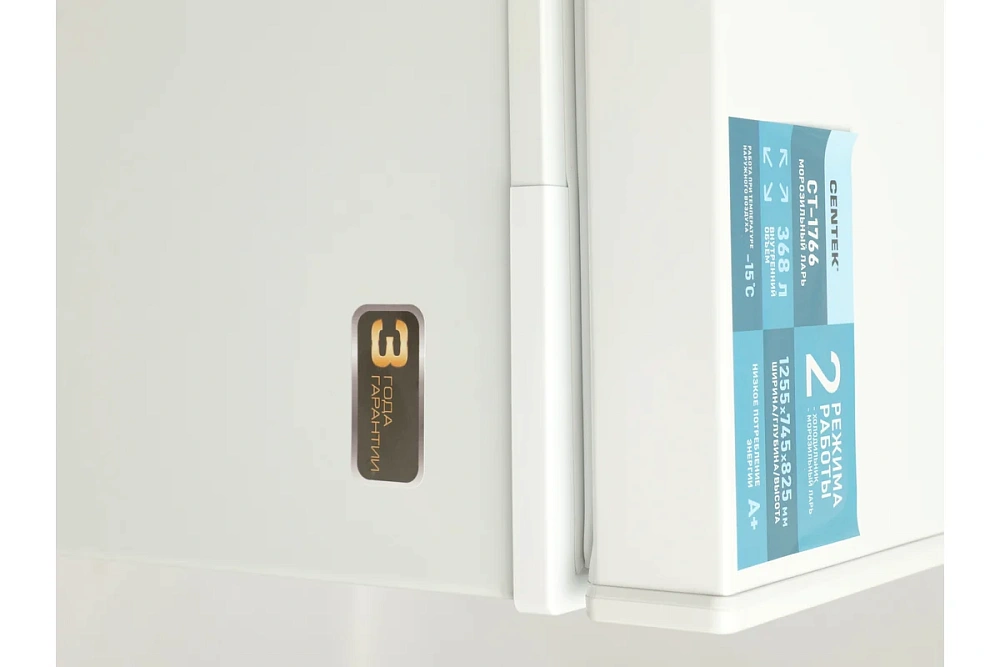 Быстрое перемещение Centek CT-1766 гарантируют прорезиненные колесики в основании. Размораживание прибора производится путем его отключения от сети питания. В качестве внешнего покрытия производитель выбрал окрашенный металл – материал, который может похвастаться высокой износоустойчивостью и долговечностью.