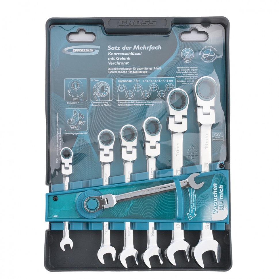 Набор ключей комбинитрованных с трещоткой шарнирные Gross 8-19мм 14891