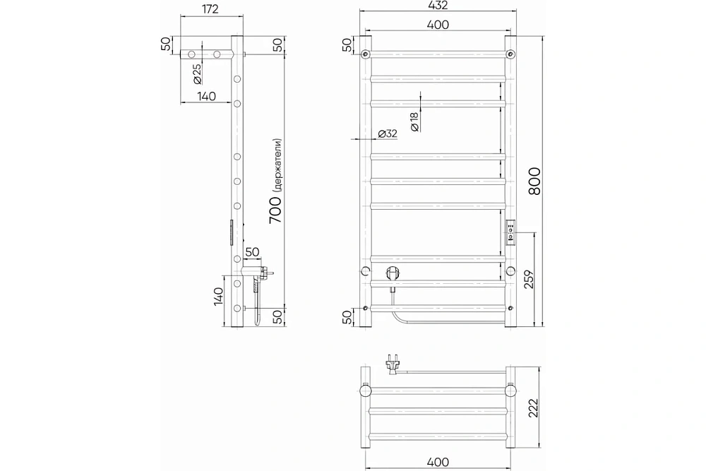 | Комплектация | Полотенцесушитель электрический - 1 шт, паспорт изделия - 1 шт, комплект для монтажа - 1 шт, держатель телескопический - 4 шт. |