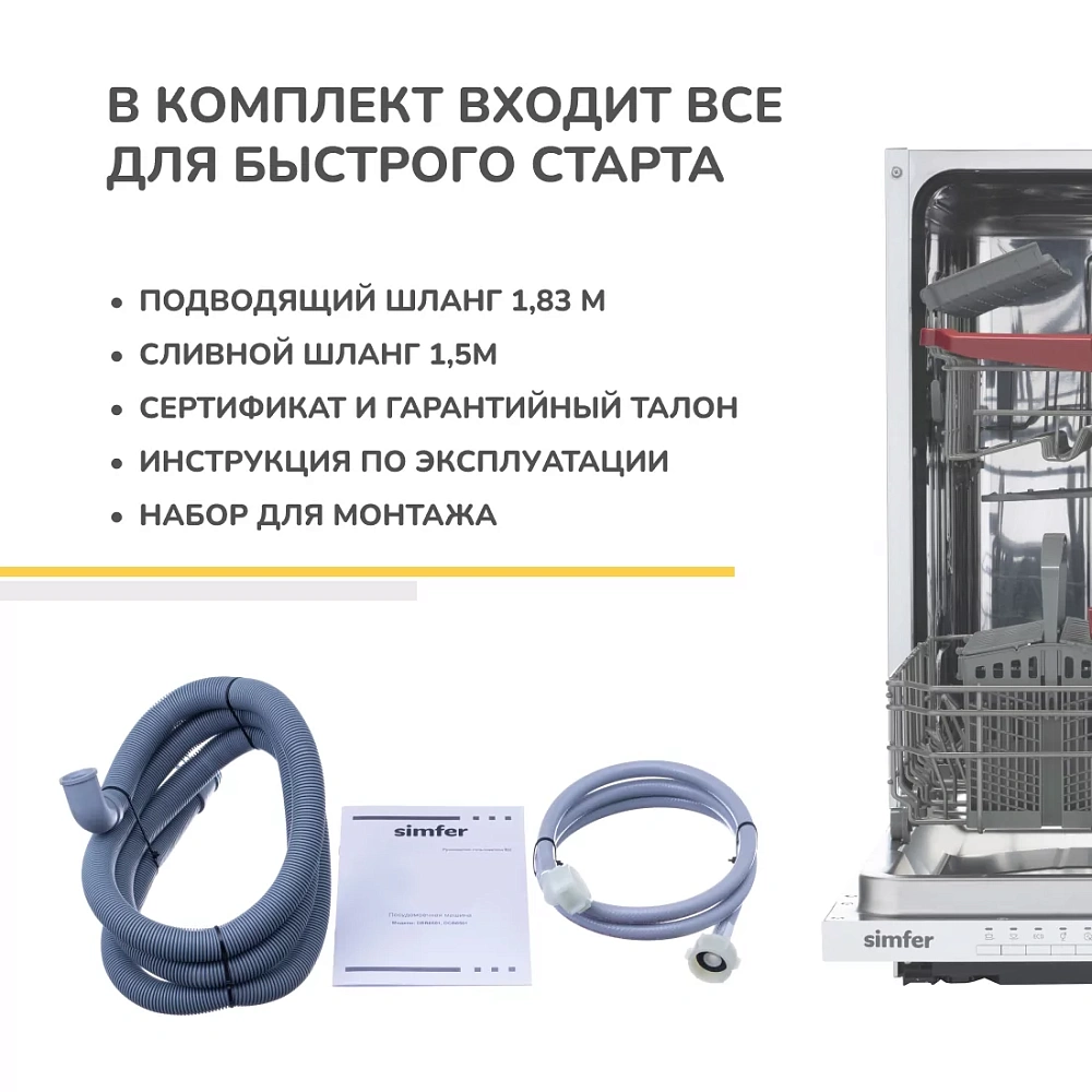 | Комплектация | Корзина для столовых приборов / полка для чашек и столовых ножей / стандартный впускной шланг / стандартный сливной шланг / винты 2 шт / зажимная лента / инструкция / гарантийный талон |