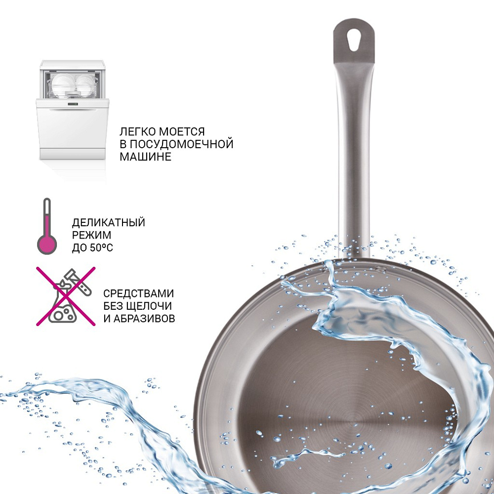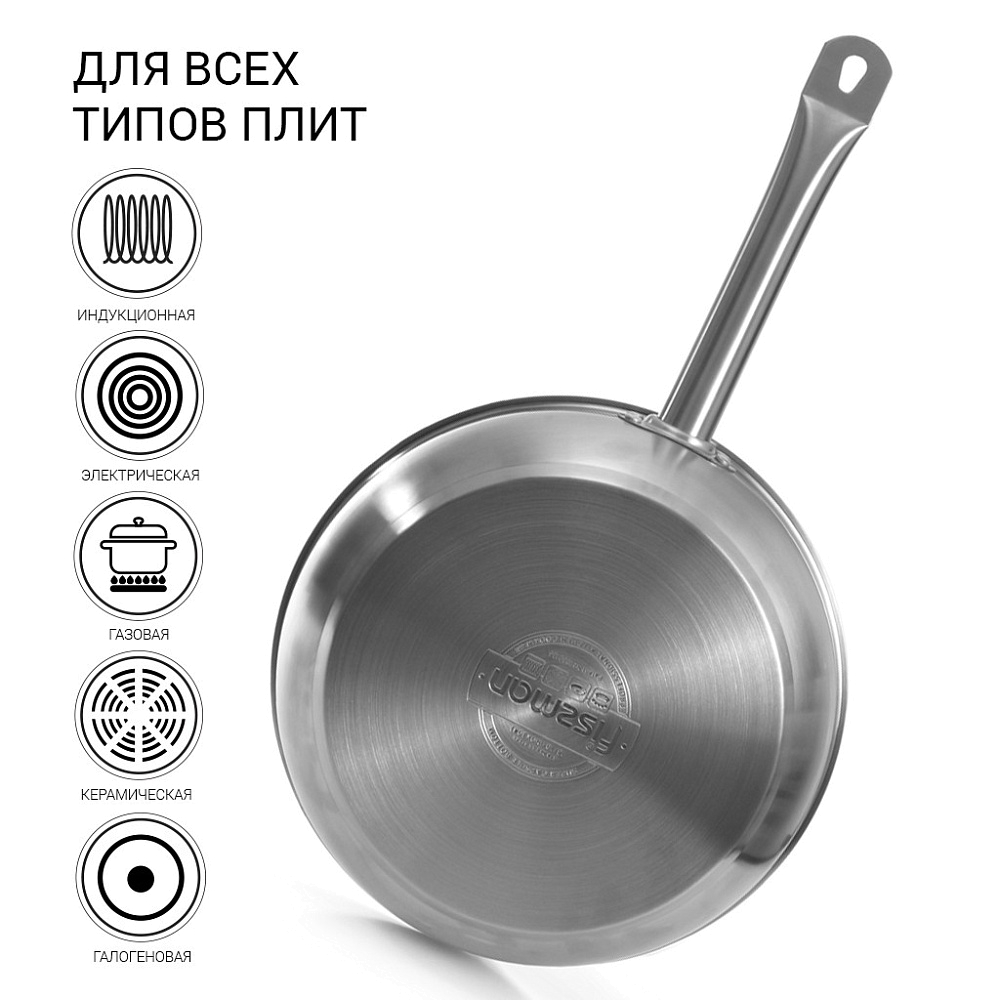Сковорода сделана из самой безопасной высококачественной нержавеющей стали марки 18/10 (INOX304), обладает коррозийной стойкостью, очень легка в уходе. Многослойное капсульное дно обеспечивает равномерный нагрев и распределение тепла благодаря алюминиевой прослойке, раскрывая вкусовые качества блюда и сохраняя все полезные свойства продуктов, а индукционный слой делает ее универсальной для всех типов плит.