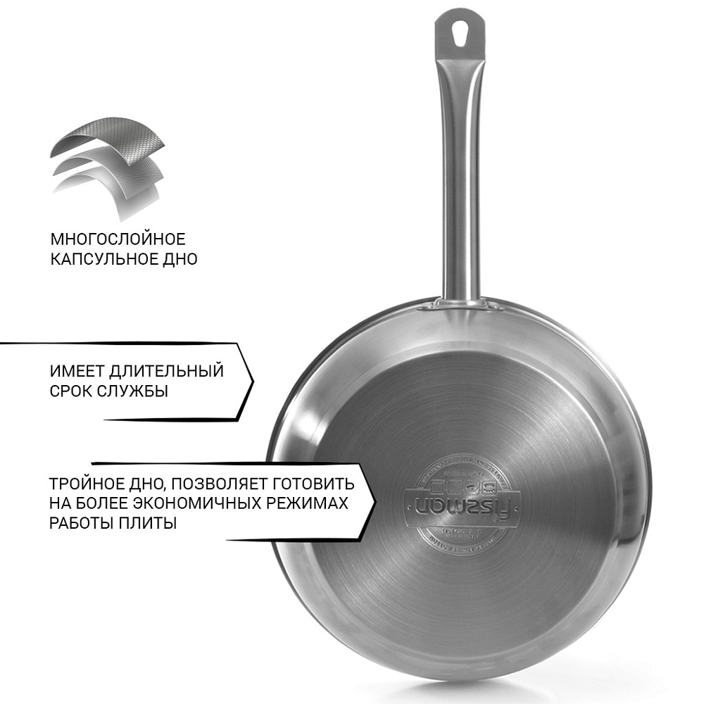 Благодаря высокой устойчивости к истиранию в сочетании с отличной коррозионной стойкостью глубокая сковорода из нержавеющей стали от компании FISSMAN - правильный выбор для удовлетворения самых жестких требований к производству и эксплуатации современной посуды.