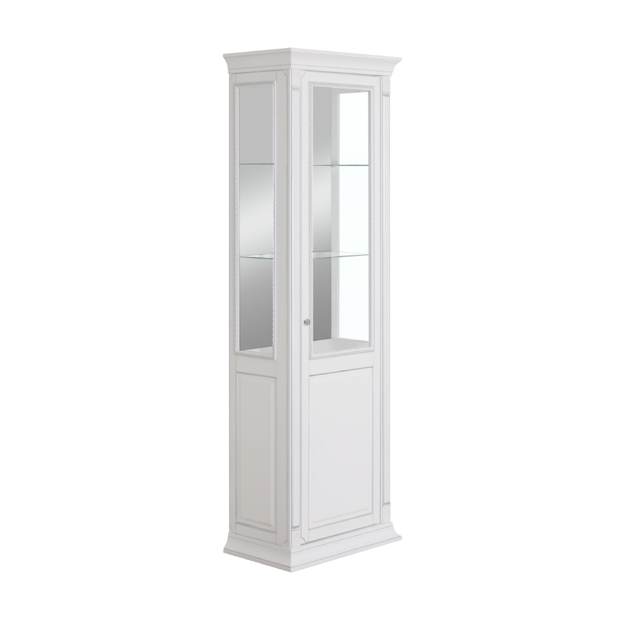 При своей высоте шкаф для посуды Александрия кажется легким и не загромождает пространство. Добиться такого эффекта помогают светлое цветовое решение, обилие стекла и зеркальная задняя стенка. Прозрачные фасады позволяют показать в лучшем свете коллекцию посуды либо редкие экземпляры семейной библиотеки. Шкаф является частью линейки мебели Александрия, выполненной в неоклассическом стиле. В коллекции представлены решения для гостиной и спальни. Ознакомиться с остальными модулями вы можете на нашем сайте, воспользовавшись поиском.