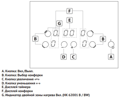 Дисплей и таймер для каждой конфорки делают управление варочной панелью удобным и понятным. Индикаторы остаточного тепла показывают, что температура зоны нагрева выше 60 градусов, поэтому на ней можно подогревать блюда, растапливать шоколад или сливочное масло.
