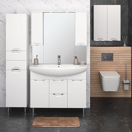 Зеркало не боится влаги и не мутнеет со временем. Дверцы на петлях с доводчиками закрываются плавно и мягко. Удобные врезные эргономичные ручки дают возможность легкого открытия дверцев; полноценные полки под хранение обеспечивают порядок внутри.